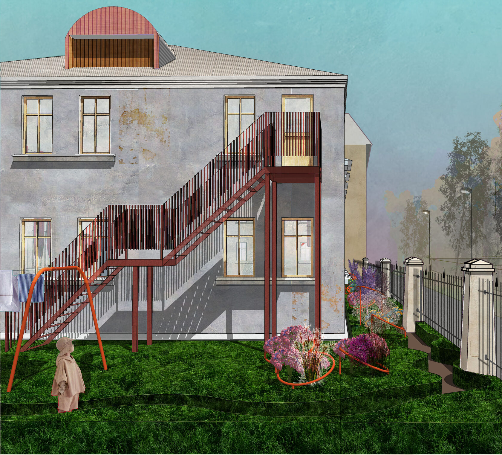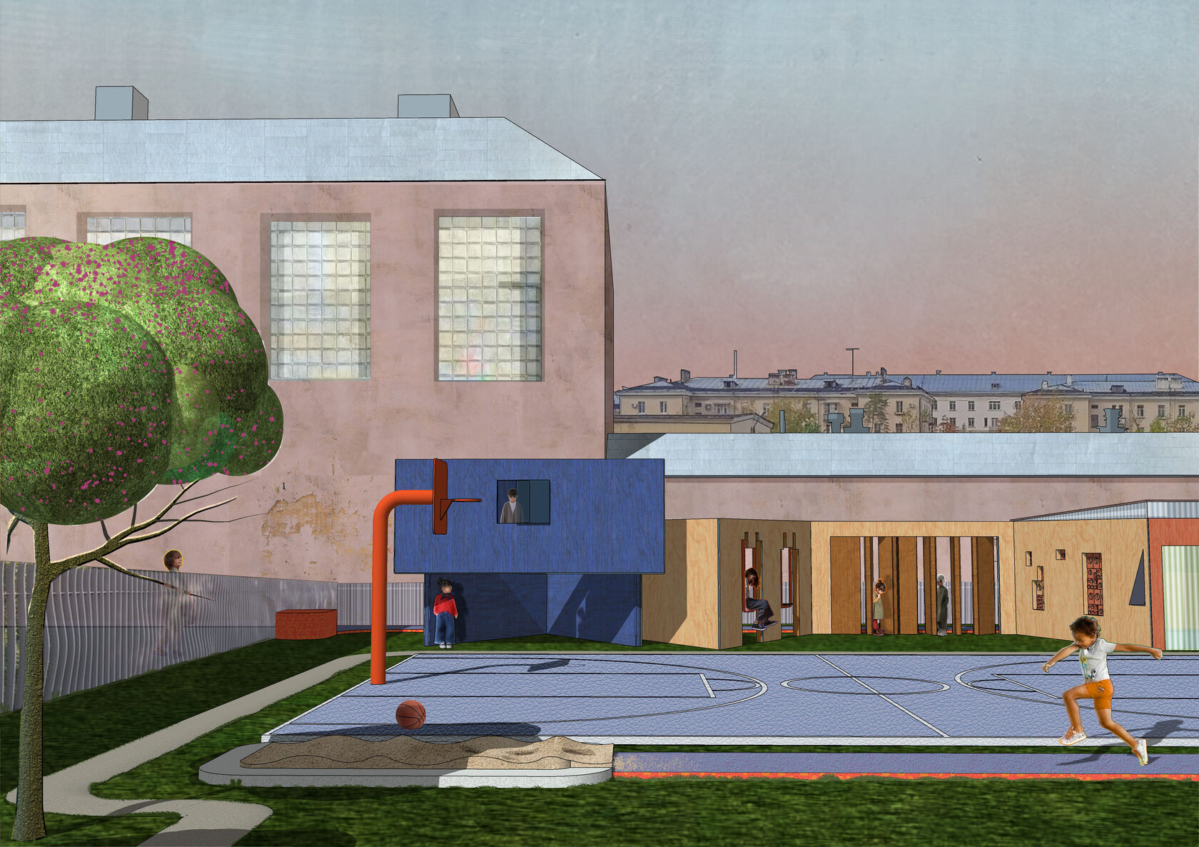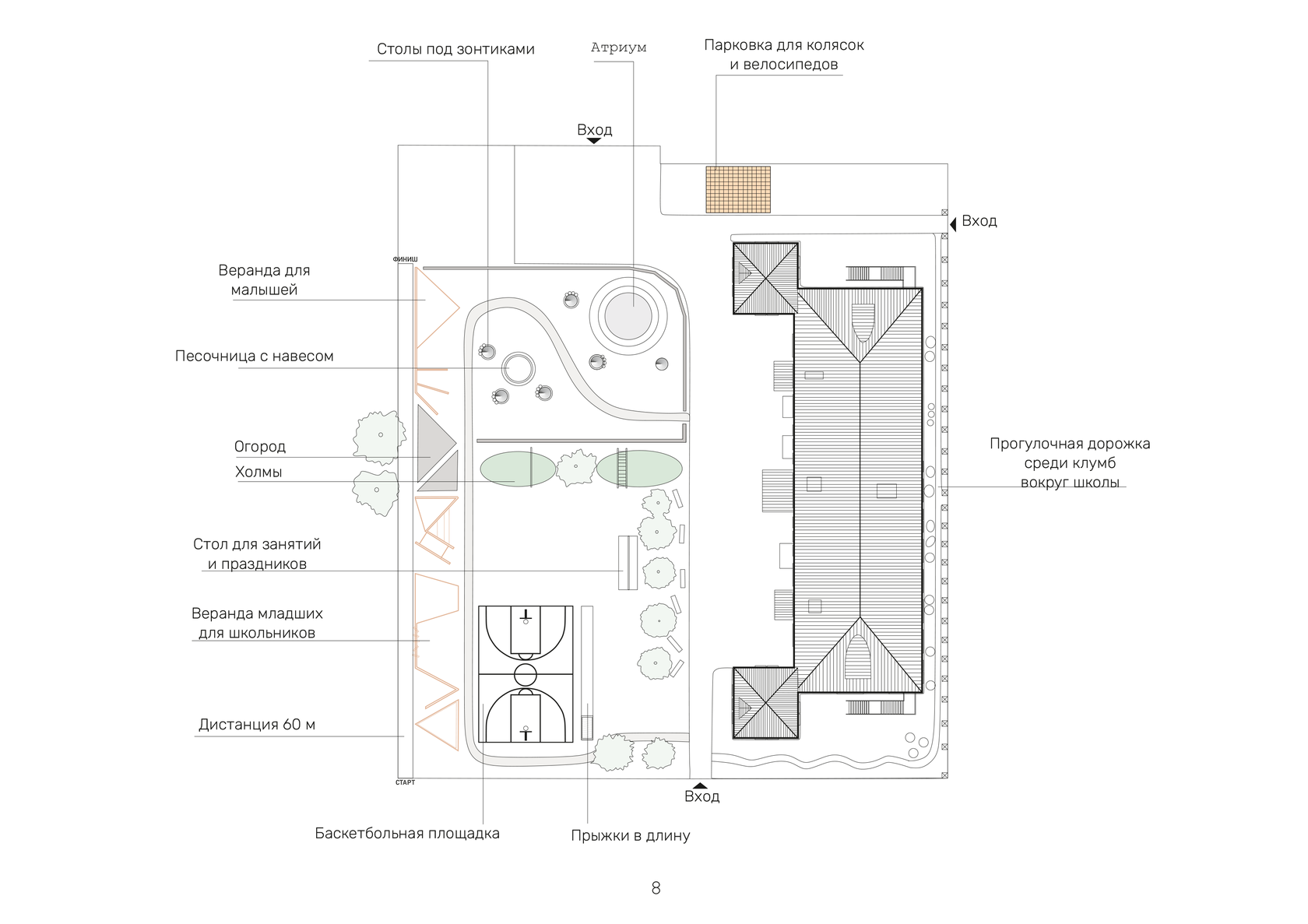 The peculiarity of the site - its location along the corridor of the neighboring school became a prerequisite for the creation of an extended veranda in the form of an open book, filled with various activities and combining many functions.