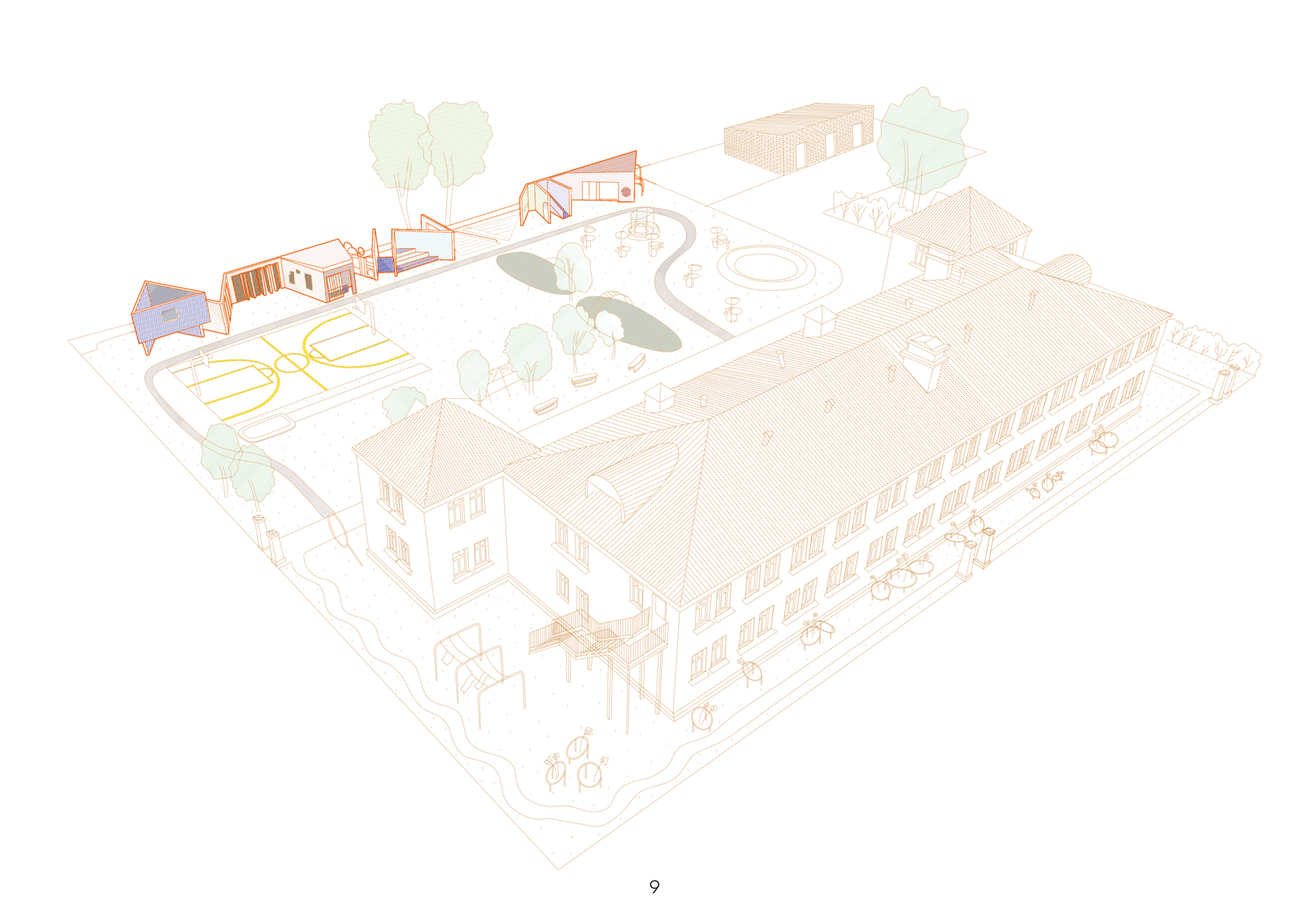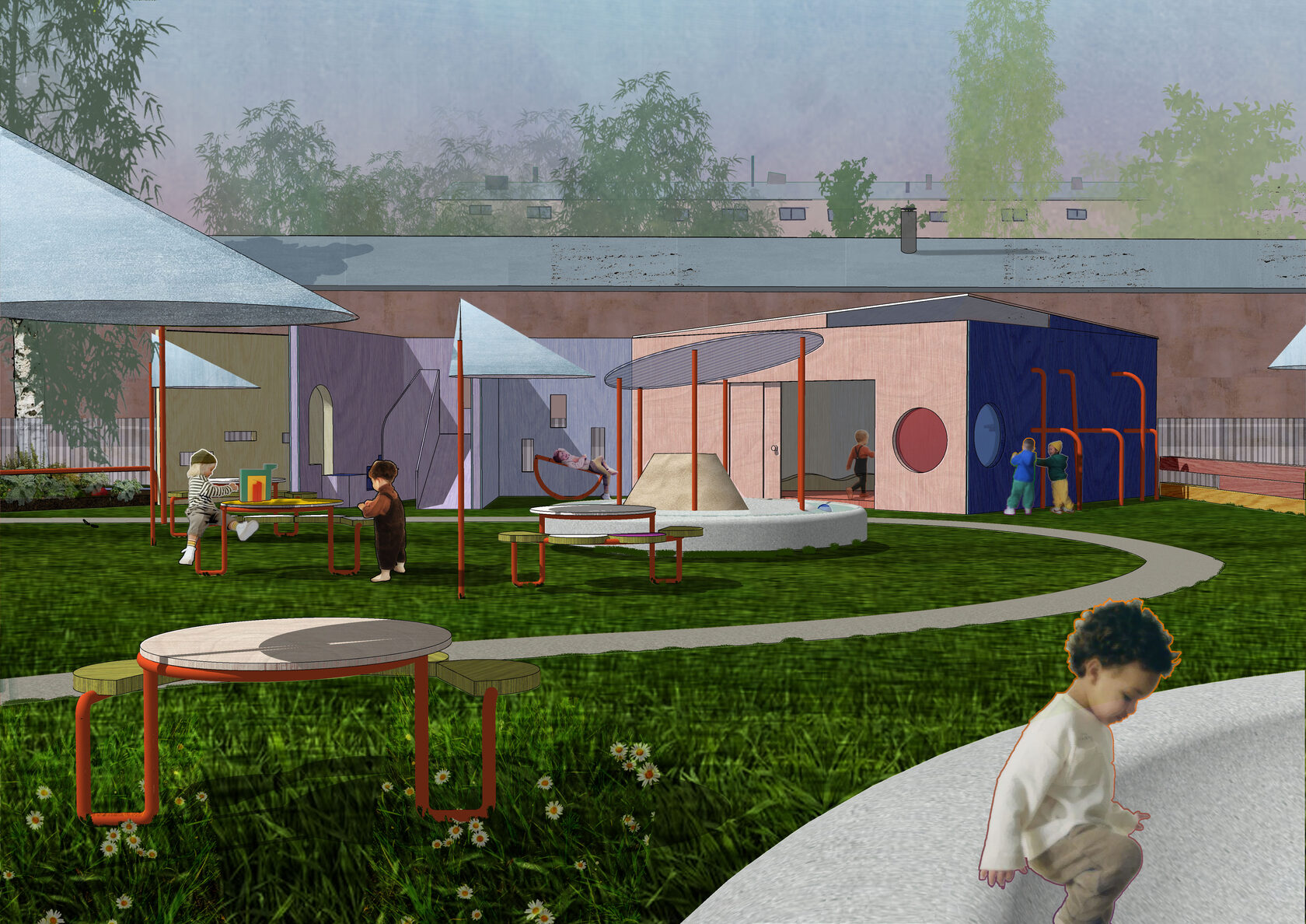 Two play hills have grown between the areas of the kindergarten and elementary school students - to become a visual division of spaces and at the same time a common place for play.