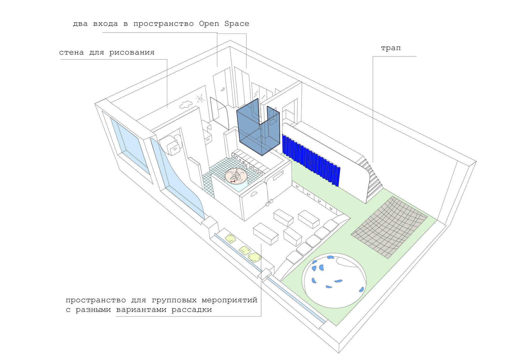Небольшая площадь и большое количество разных активностей инициировали создание