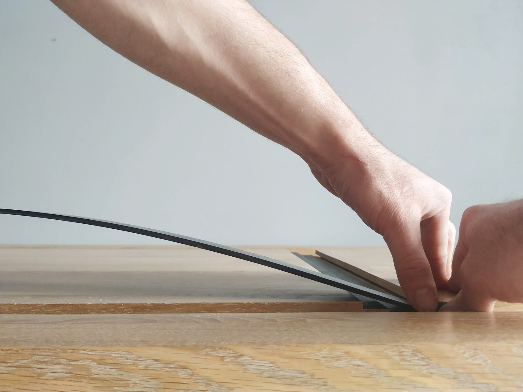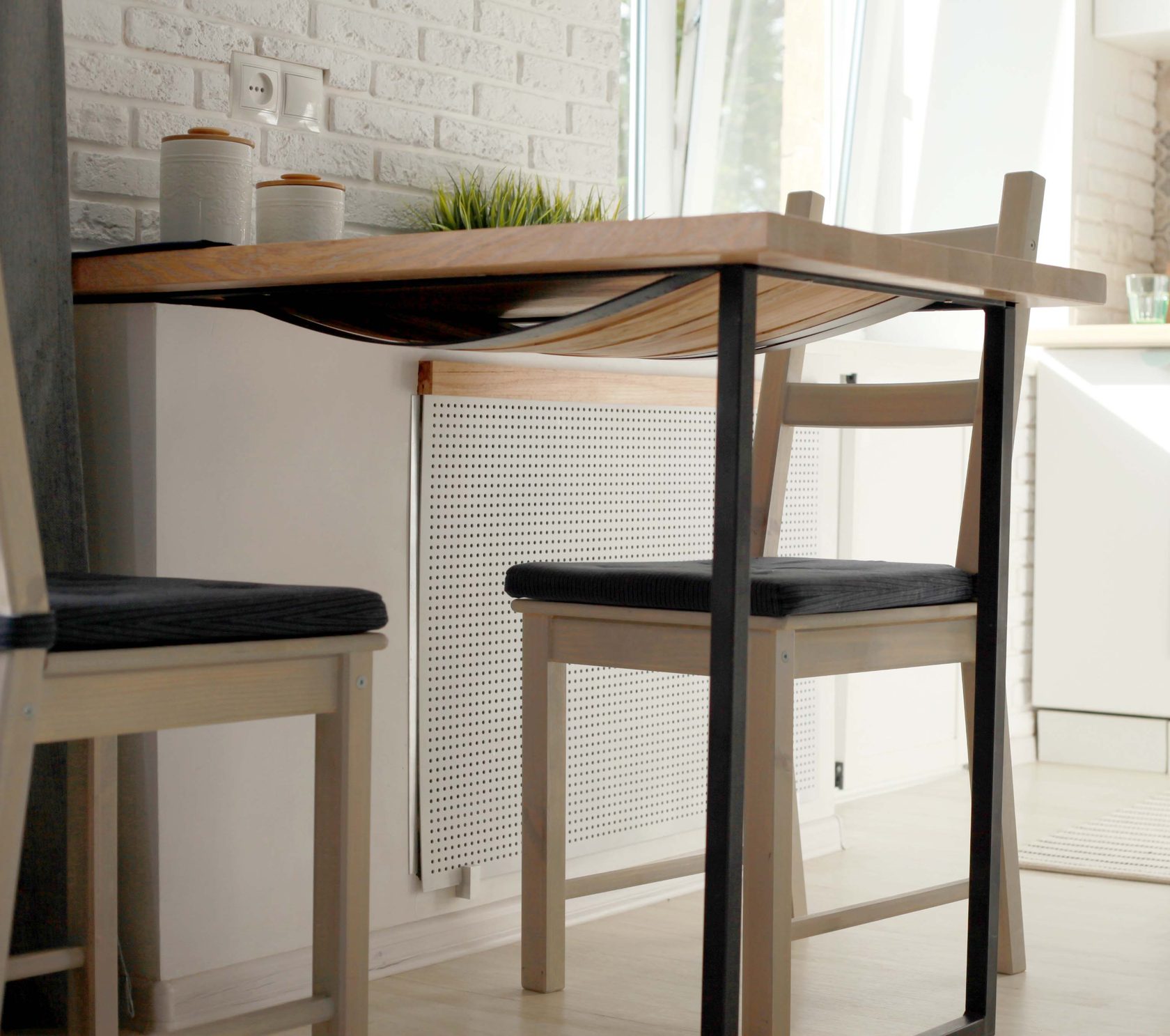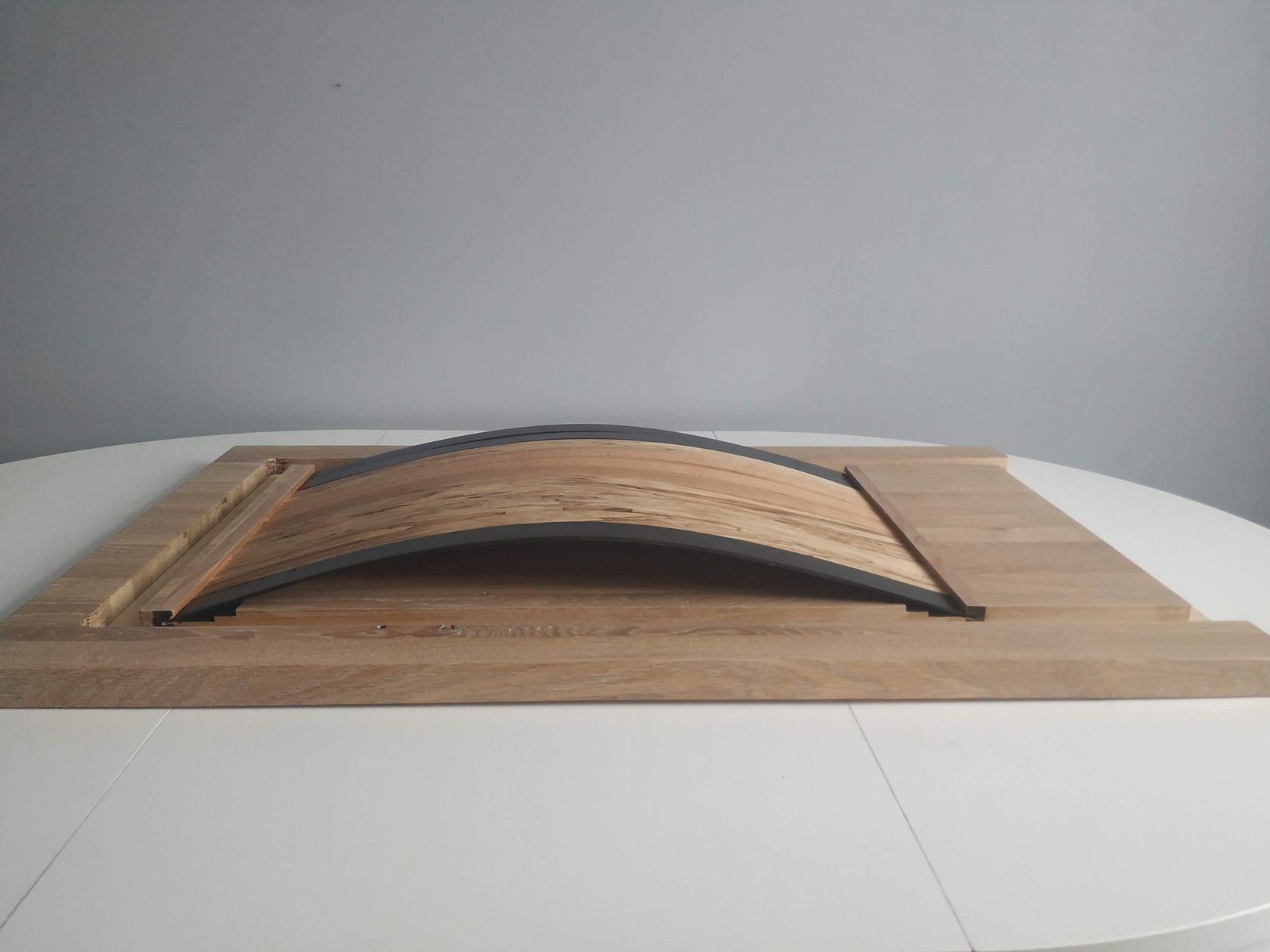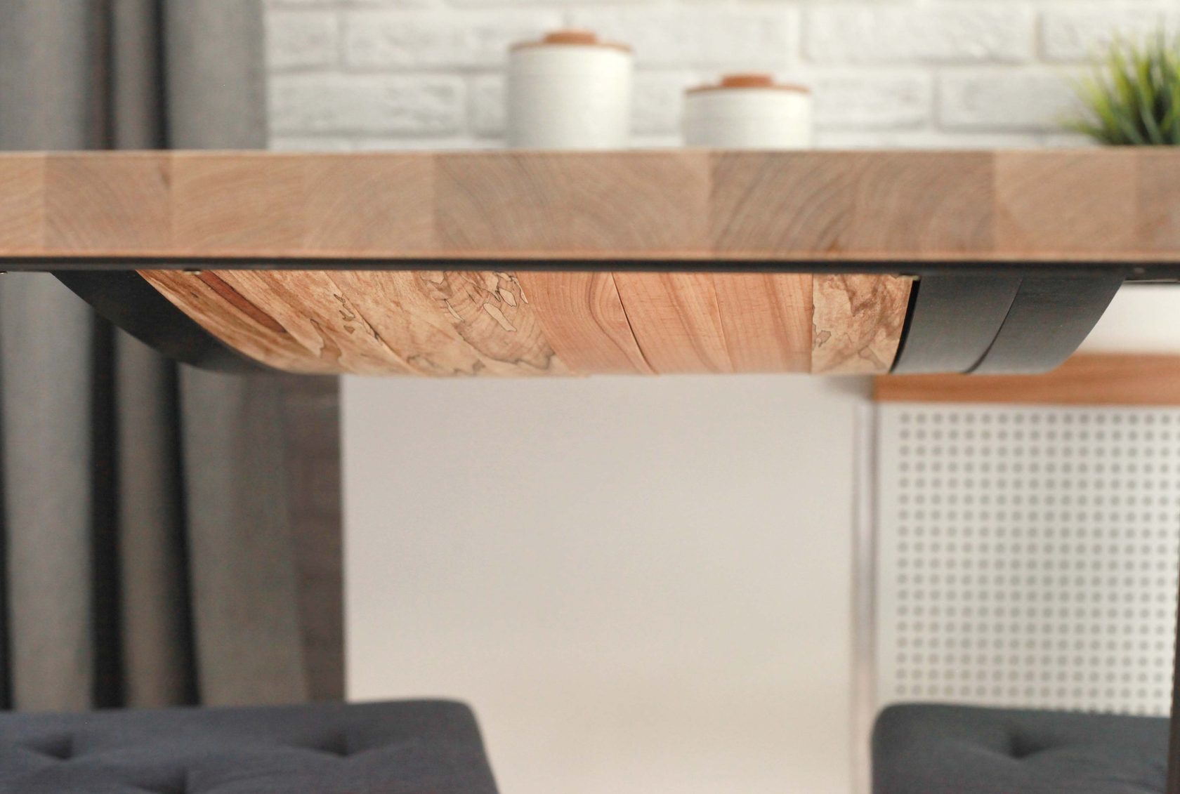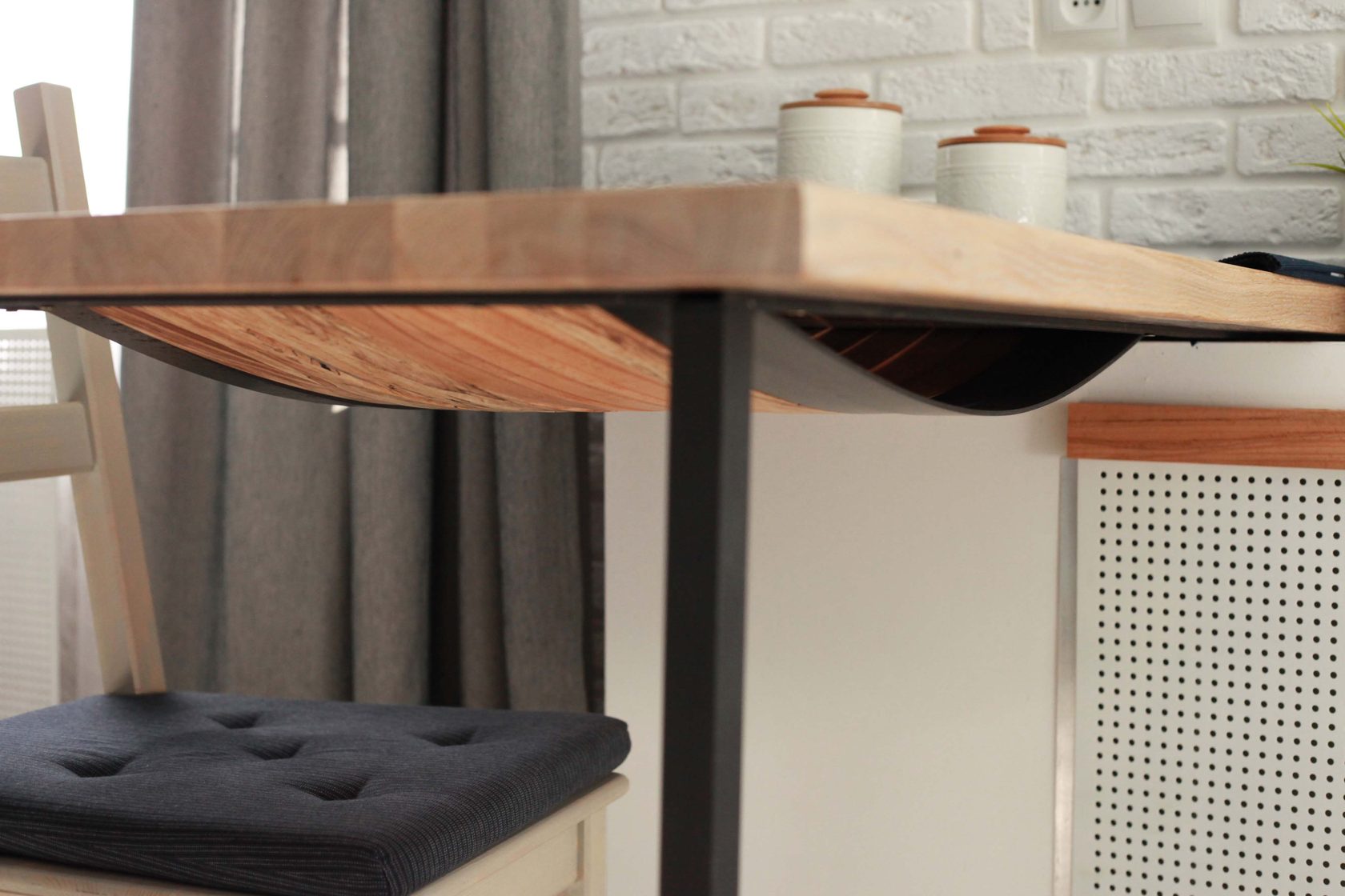 This is not just a dining table. Its feature is a pocket made of thin wood stripes.