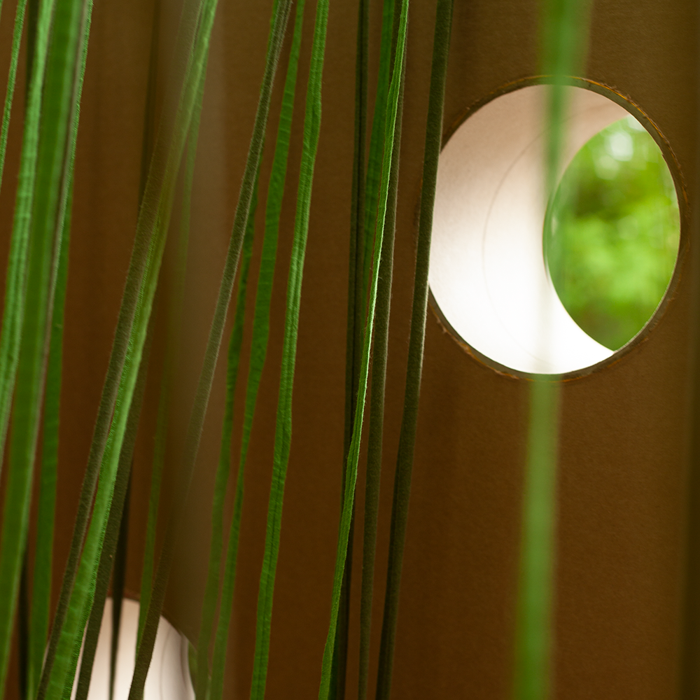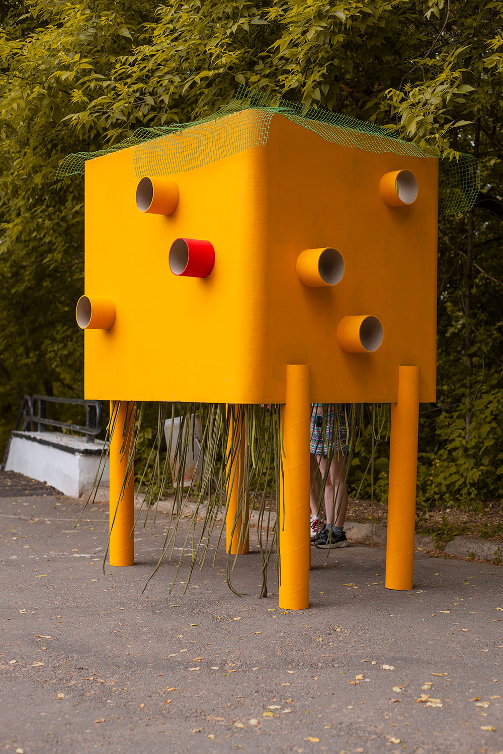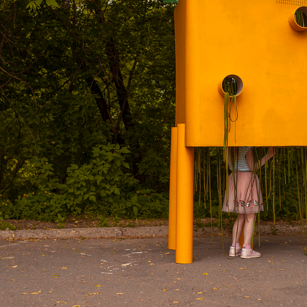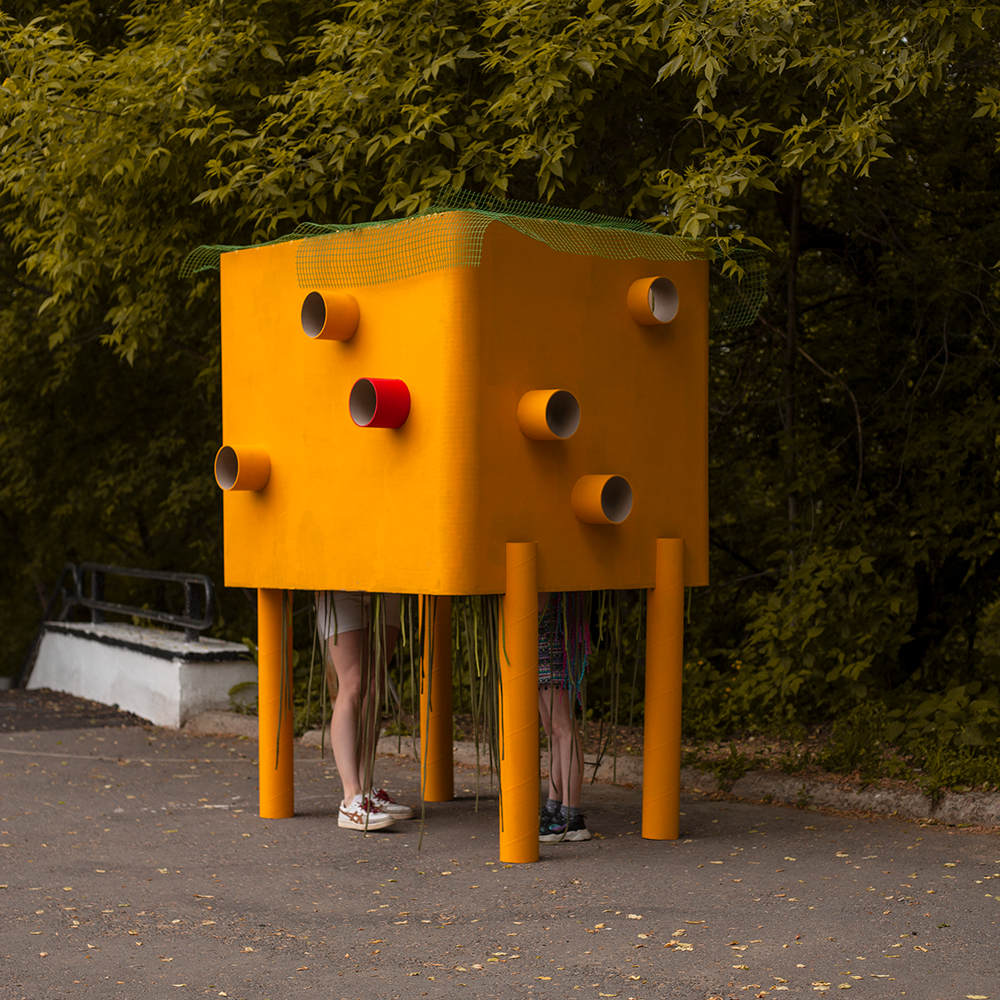 Cabins are made of honeycomb cardboard, cardboard spools and additional parts made of plywood and fiberboard.
