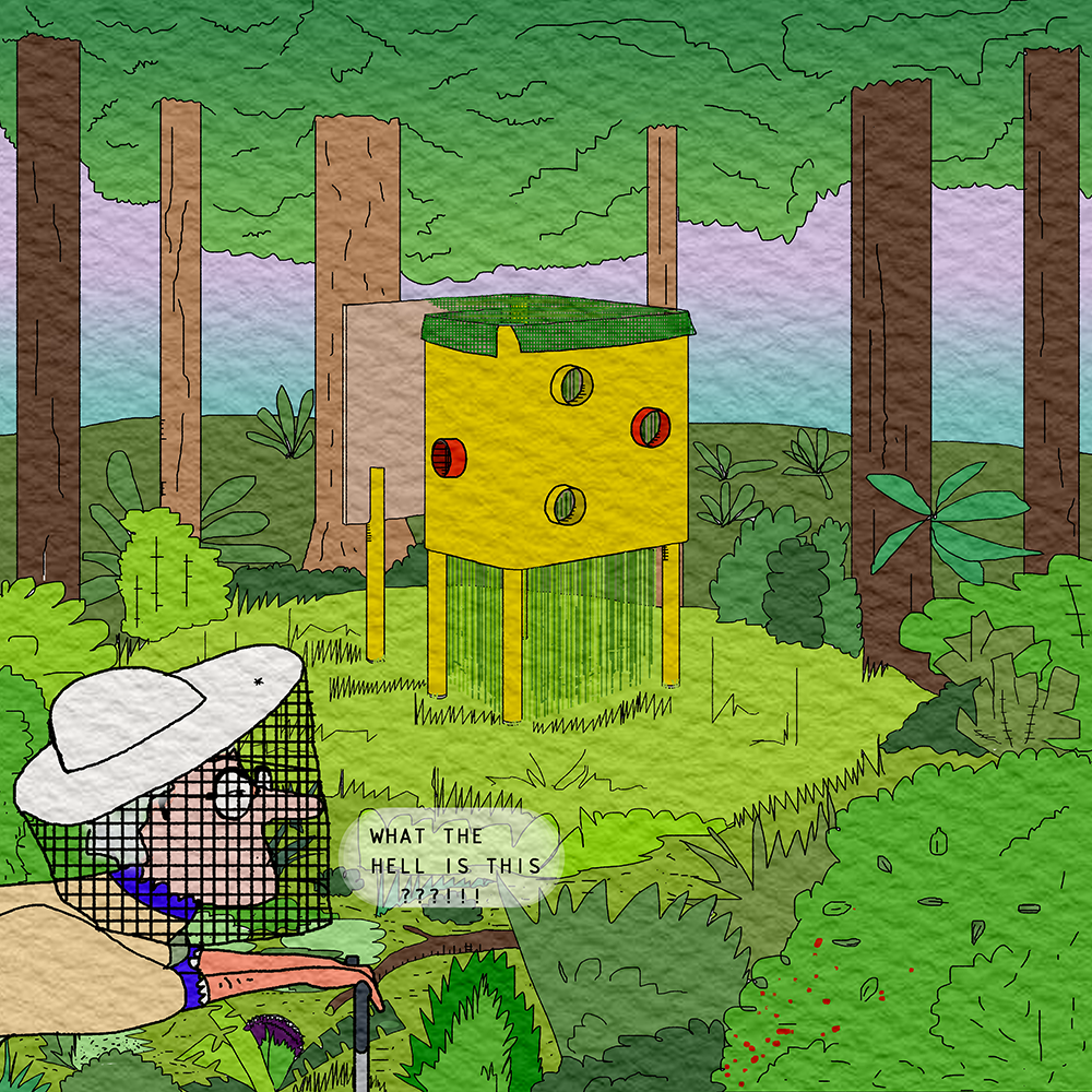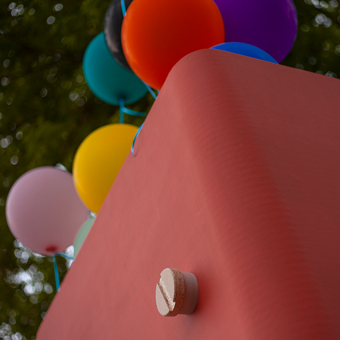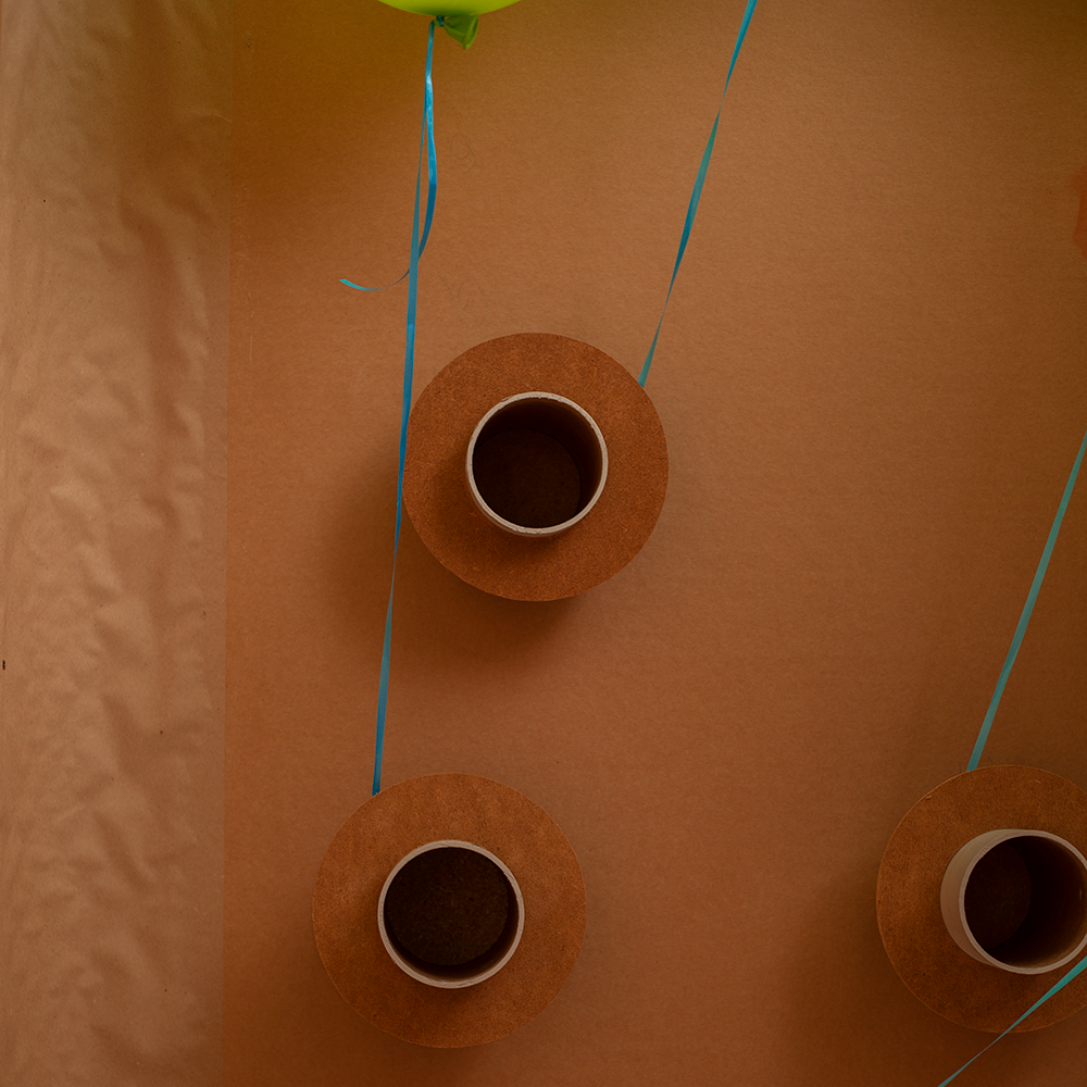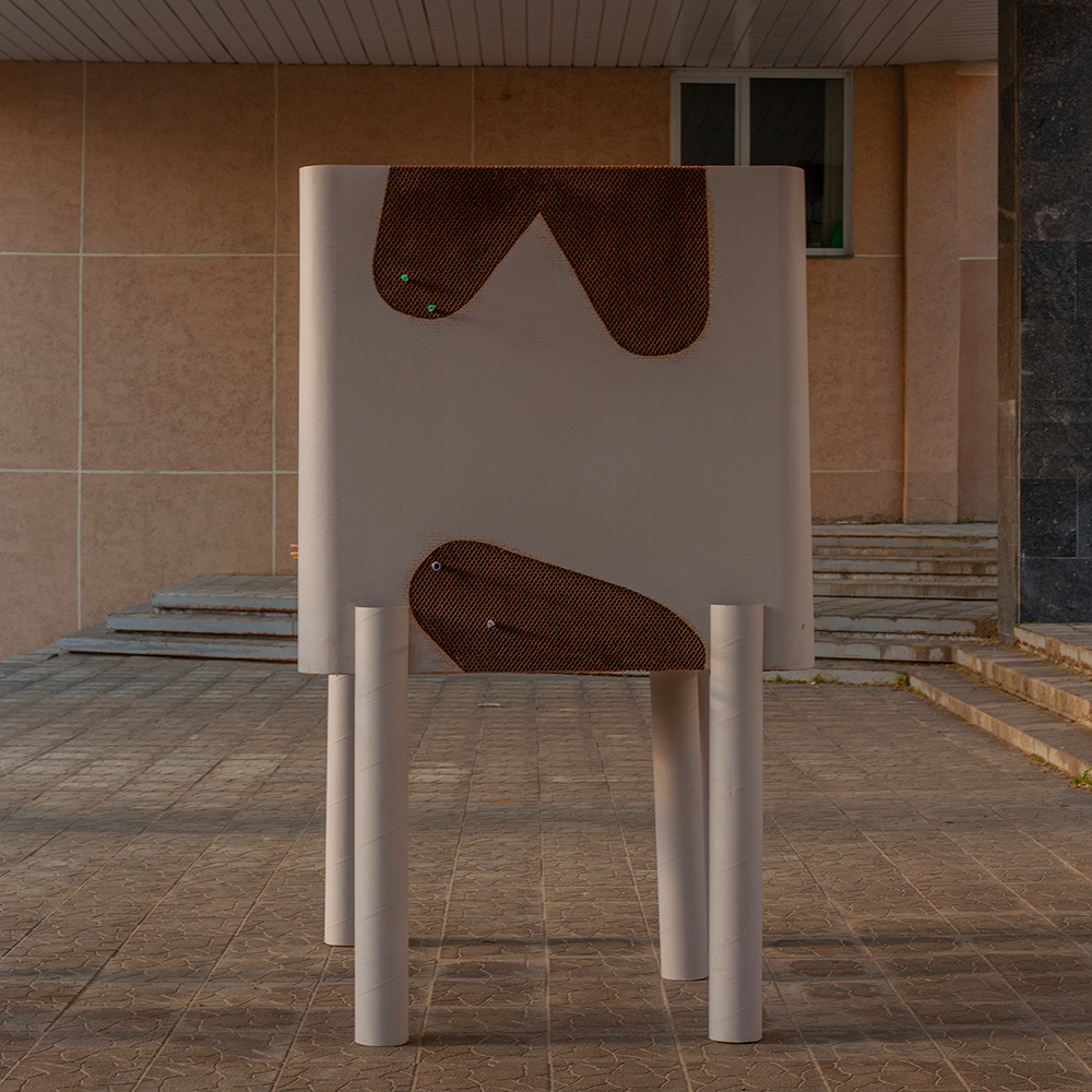 Cabins are made of honeycomb cardboard, cardboard spools and additional parts made of plywood and fiberboard.