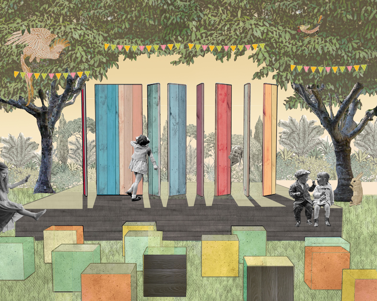 STAGE for performances. In place of the old children's slide I propose to build a stage that will face 2 sides: towards the road and towards the garden for big and small performances. There is a mobile wall in the centre of the stage consisting of rotating parts, during the performance, it serves as the back decoration and the rest of the time, children can play and hide there thus, children will not be afraid of the stage, but will perceive it as a playing space.
