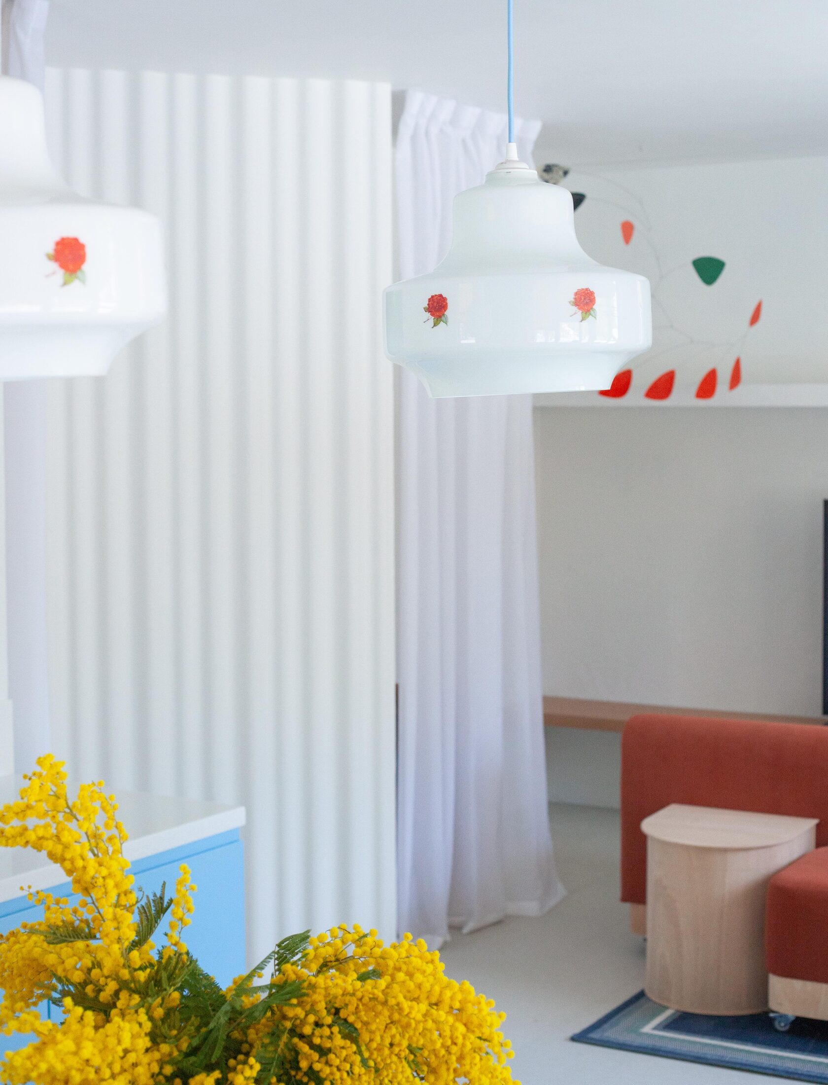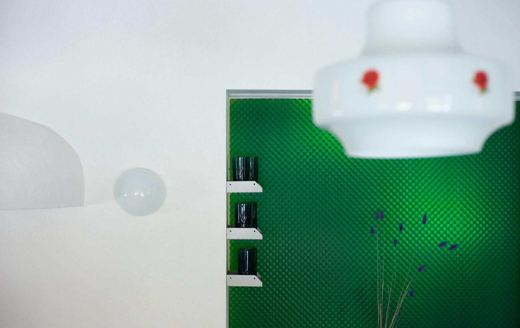 We hid a small workplace behind a partition of wave-shaped gypsum panels.