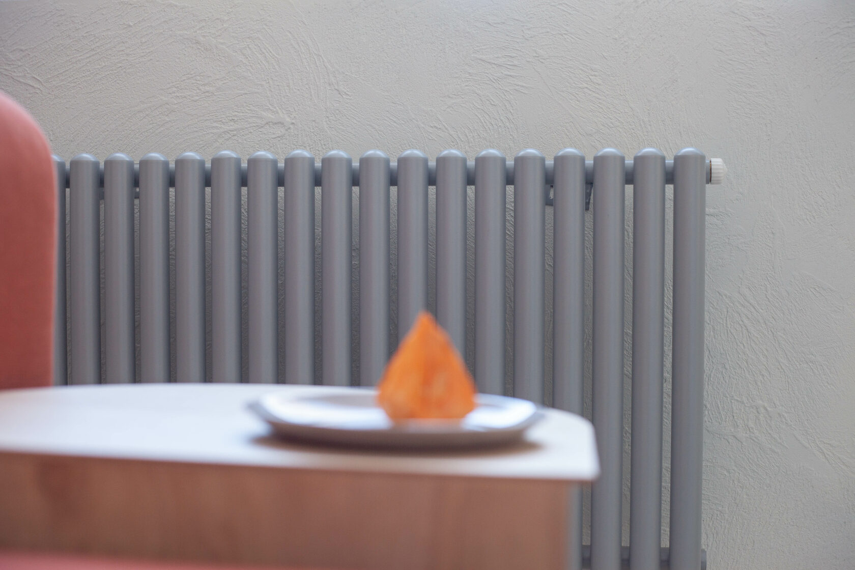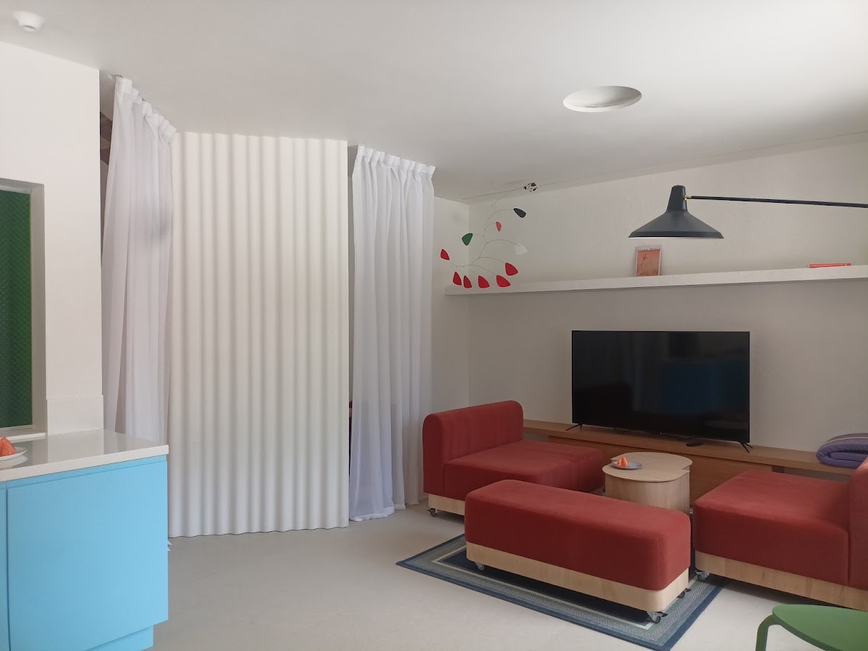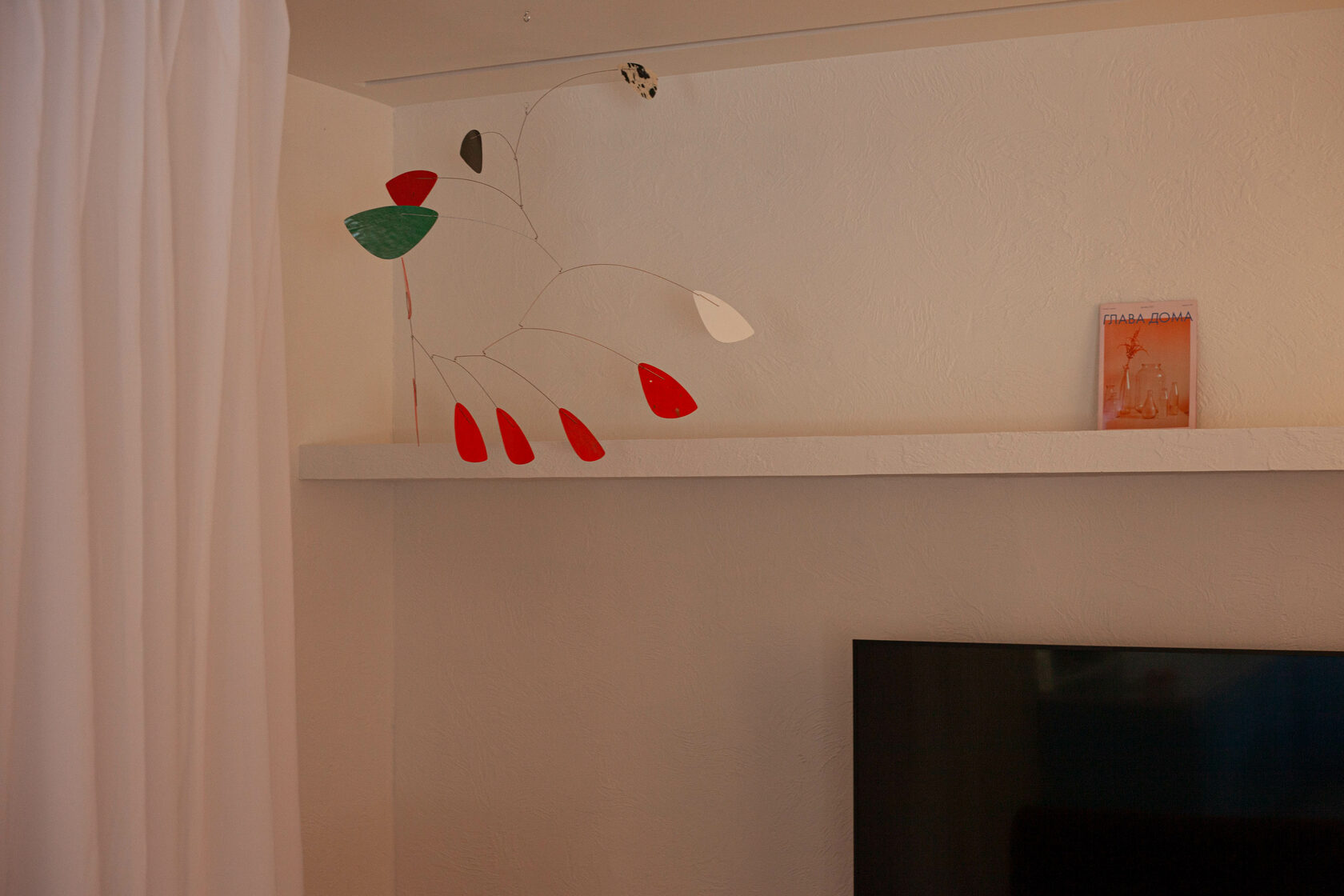 Гипсовая перегородка в виде шторы и настоящие шторы по своей конфигурации и смыслу имеют отсылку к тканевой ширме и традиции занавешивать тканью входы на даче, спасаясь от комаров и сохраняя движение воздуха в помещении.