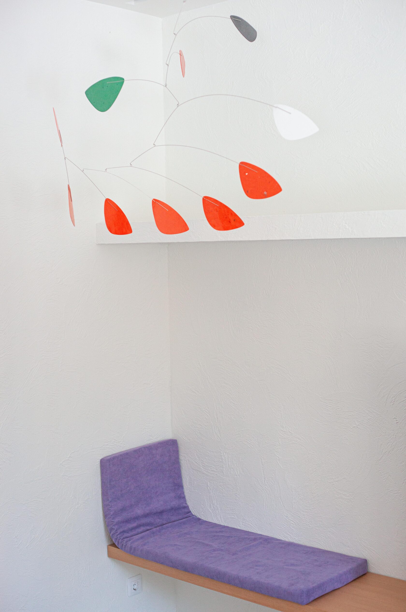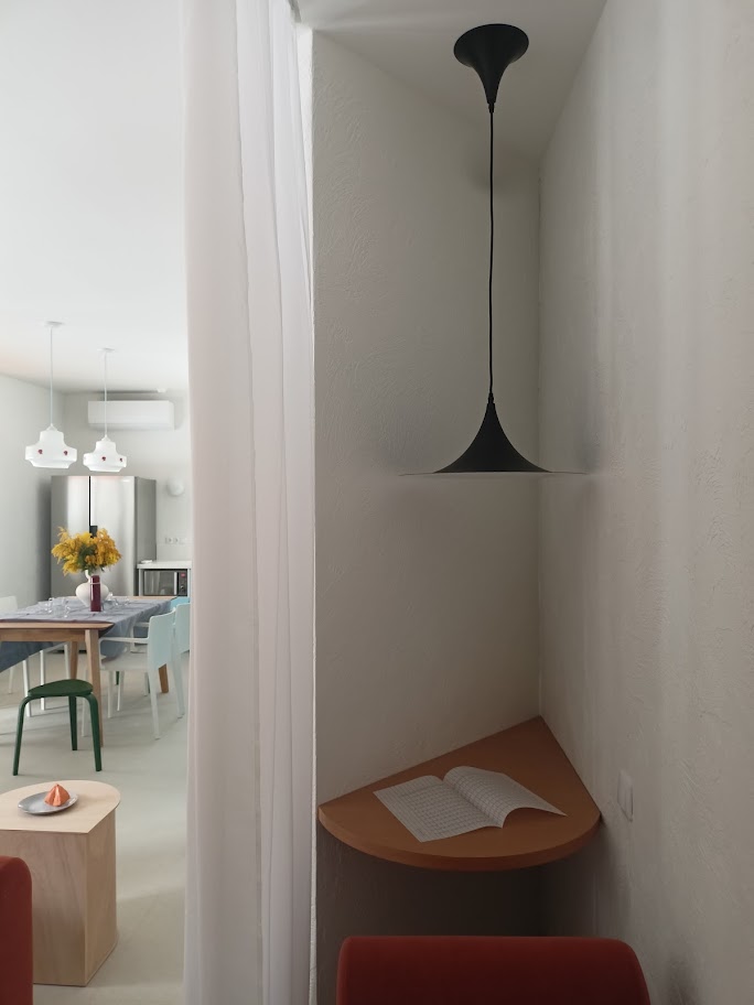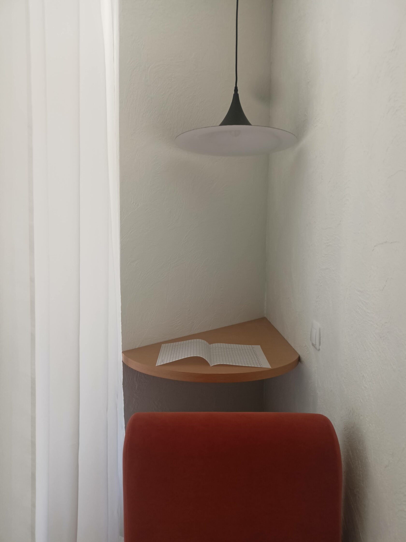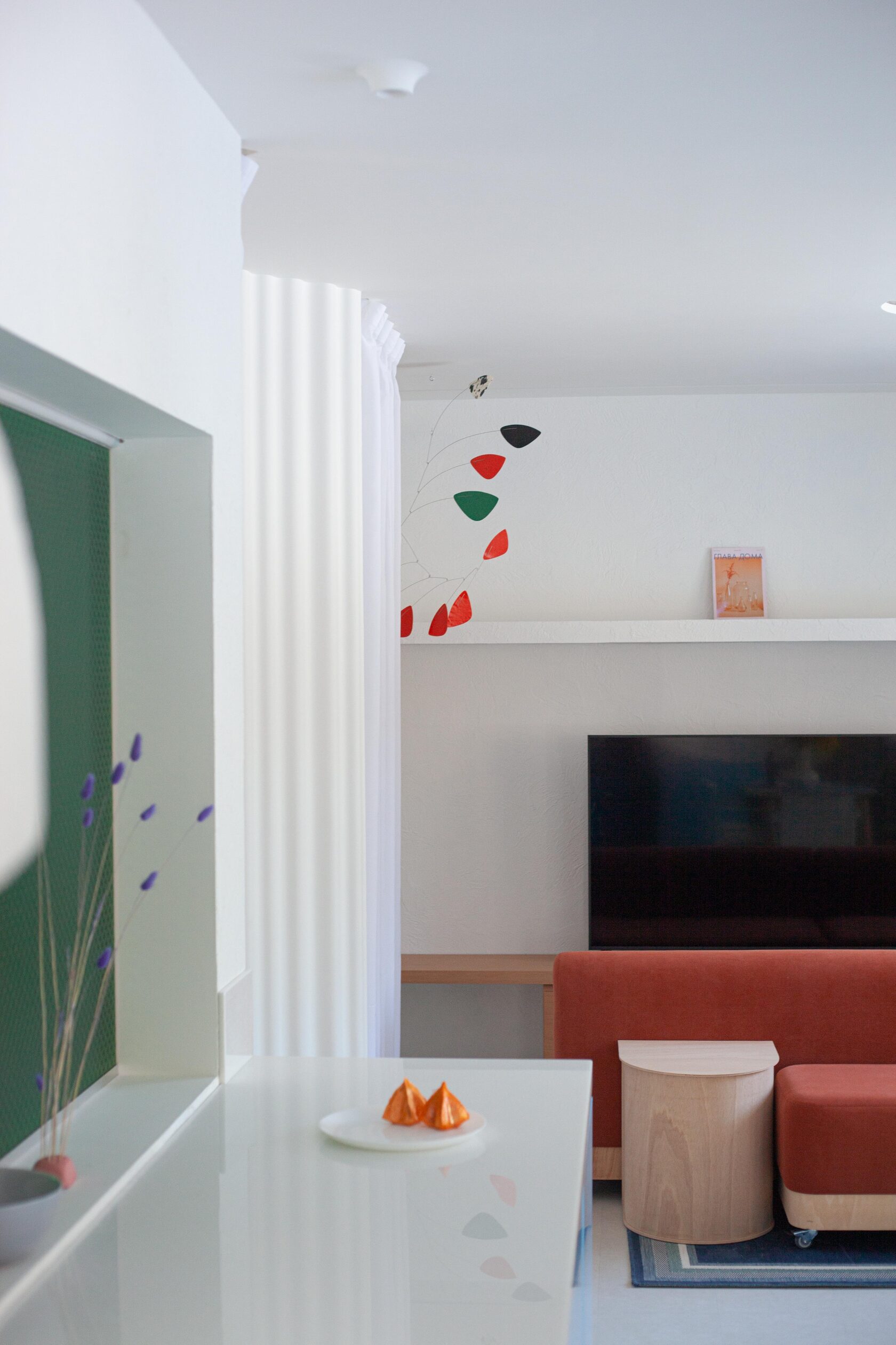 За перегородкой из волнообразных гипсовых панелей мы спрятали небольшое рабочее место, кресло которого является частью модульного дивана.