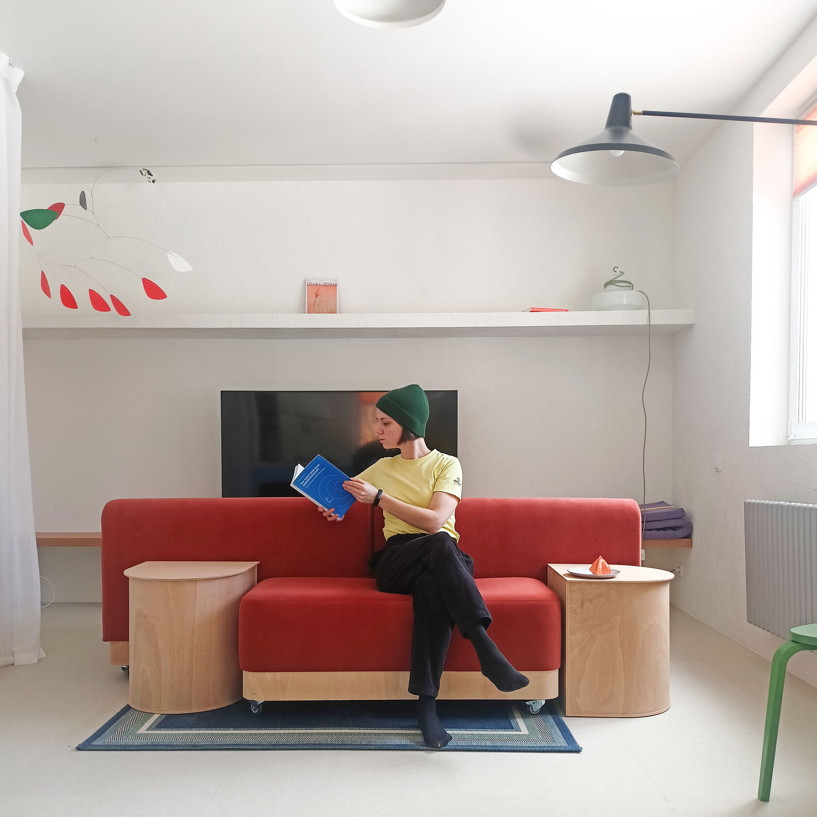 UU-TABLE из нашей линейки мебели стал частью дивана и зоны отдыха.
