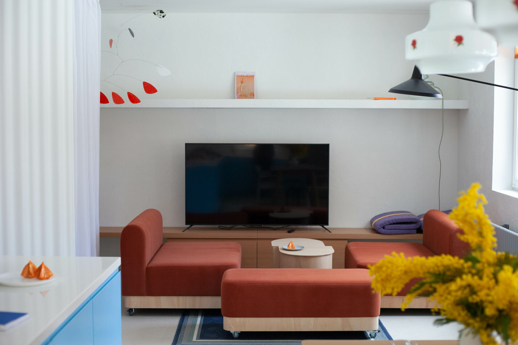 В зоне отдыха за функциональное и многовариантное использование пространства отвечает модульный диван.