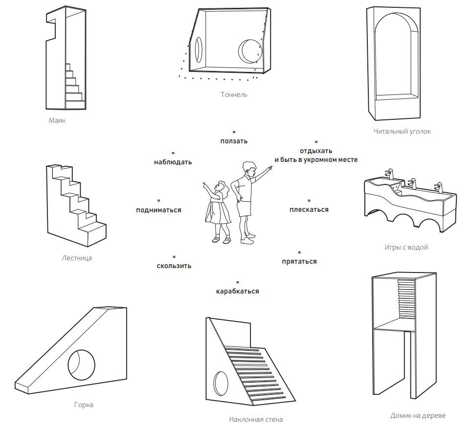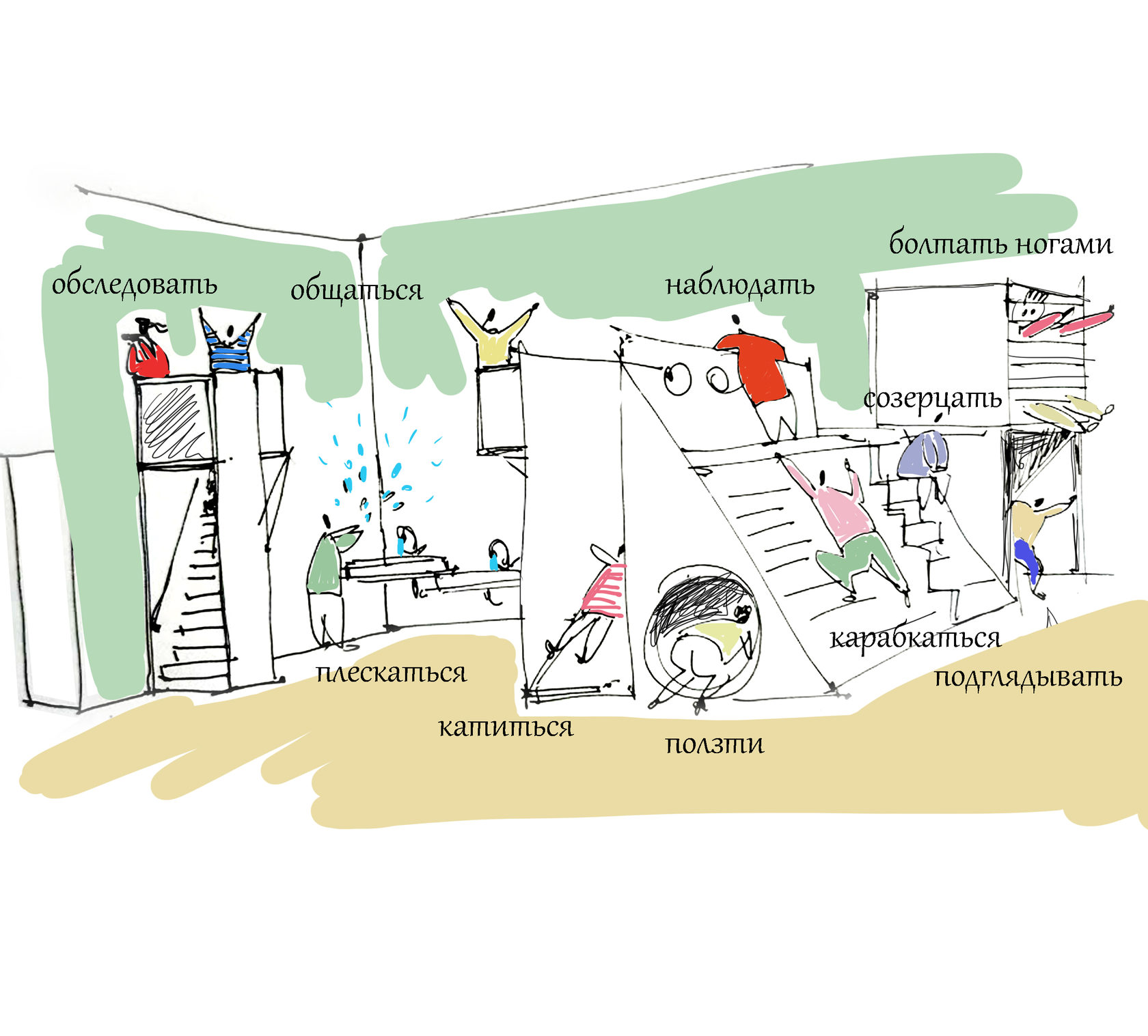 Мы проанализировали рисунки детей, изучили активности, которые они нарисовали, провели ассоциации и получили набор действий, которые можно совершать на «острове» во время игры. Для детей оказалось важно: быть на острове с друзьями, но при этом иметь место, где можно спрятаться и побыть одному, иметь возможность забраться повыше и сверху понаблюдать за происходящим, спрятаться и почувствовать себя в домике соревноваться и показывать на что он способен То есть виды деятельности, как активные, так и спокойные. Мы думали не только о движениях, которые может совершать ребенок во время игры, но и о тех смыслах, которые движения под собой подразумевают. Например, забраться наверх по наклонной горке- значит показать, что он может, а забраться на ту же высоту по лестнице- добиться того же, но привычным способом. Или забраться по лестнице на маяк- цель у действия- посмотреть вокруг, а забраться наверх в домик- это спрятаться подальше от всех.