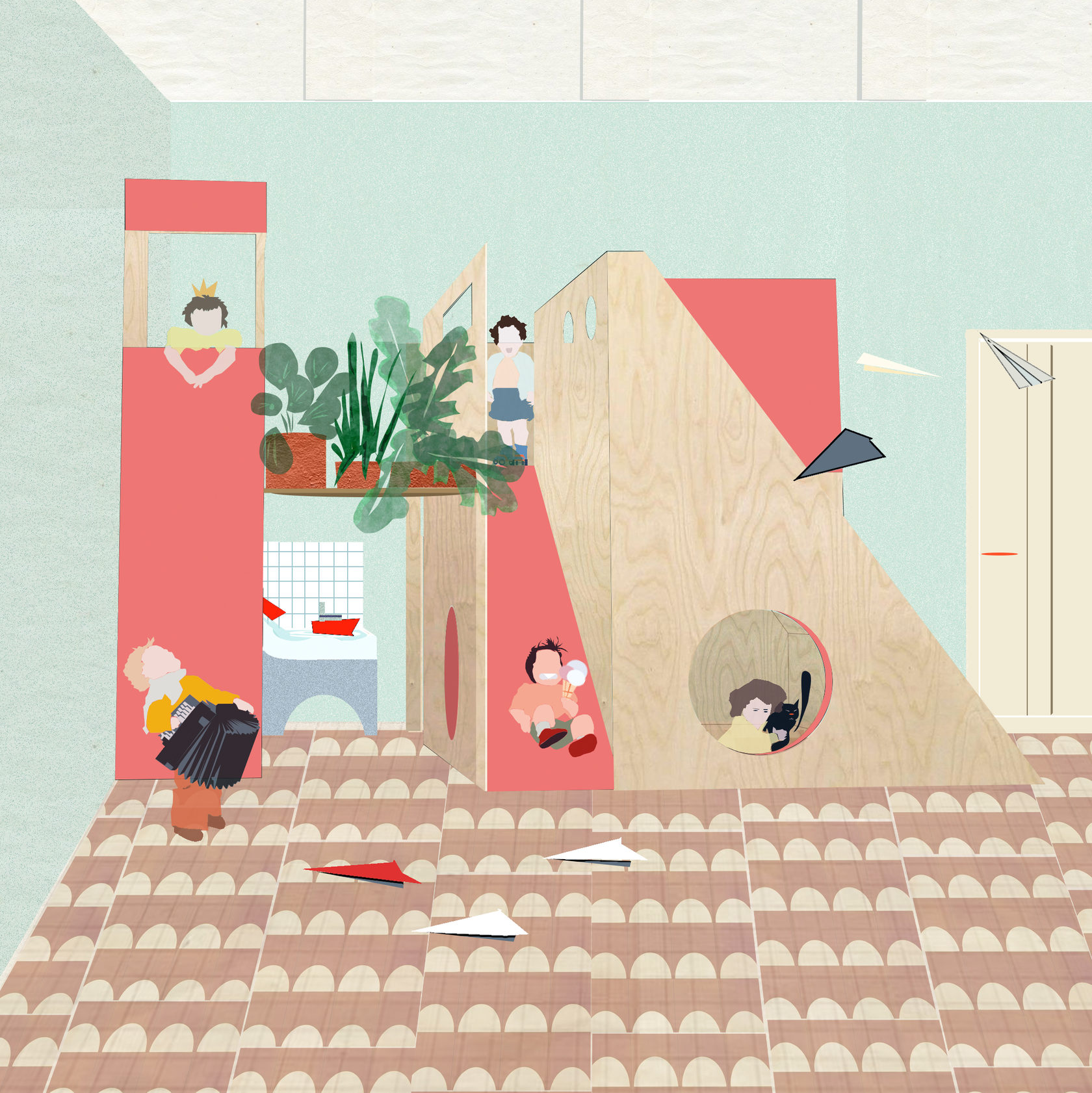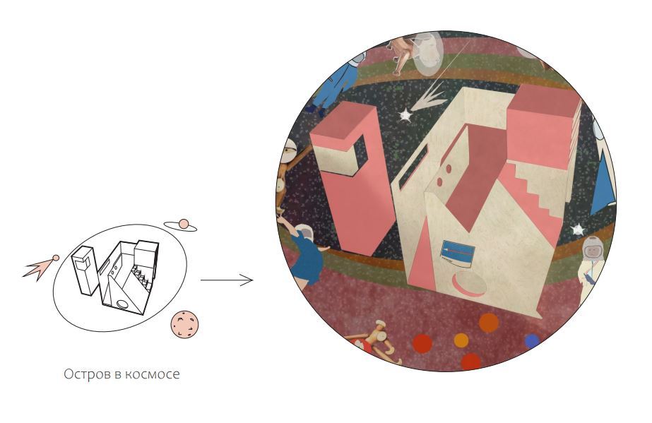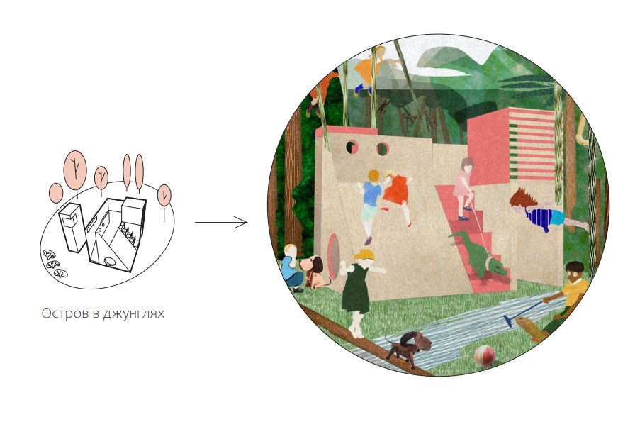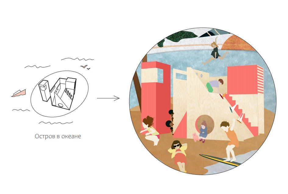 Самая главная концепция проекта- это создать персональный мир для ребенка на маленьком островке пространства. В нашем проекте мы хотели создать пространство для детей, которое позволит максимально раскрыть их фантазию и вберет в себя разные виды активностей, взятых их жизни. Нам хотелось создать такую площадку, где действие ребенка не будет коротким и односложным (поднялся- спустился), а с возможностью постоянно перемещаться и находиться в движении, но при этом иметь остановки и паузы : поднялся,пробежал, присел,спрятался, скатился, прополз, выглянул а потом немного отдохнул и побежал дальше. Это даст возможность ребенку создавать маршруты, осуществлять разные варианты игры и последовательностей действий, учиться выбирать куда двигаться дальше. Независимо от ситуации в стране, мире, несмотря на карантин и ограничения, у ребенка есть своя вселенная на островке, где он сам придумывает правила игры и сценарий событий.