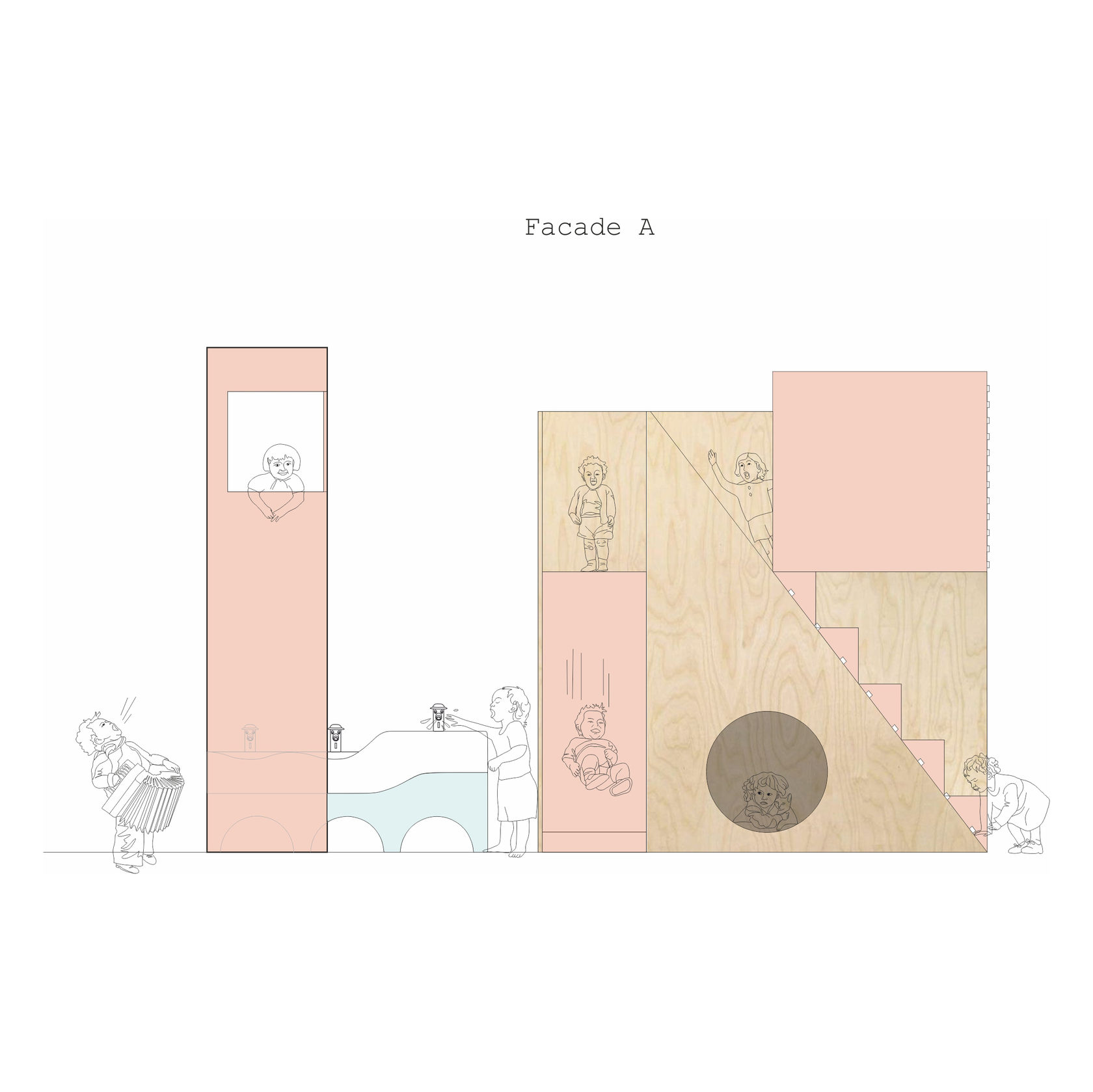 Нашей задачей также было не просто создать интересное место для игры, а сделать само пространство безопасным для детей. Поэтому мы использовали нормативы, разработанные для проектирования детских площадок: высота ограждений, расстояния для проемов и размеры отверстий. Создавая этот комплекс мы также думали о том, чтобы воспитатели могли со всех сторон видеть детей, играющих на нем и при необходимости помочь им, дотянуться или достать до ребенка, а также свободно подойти к умывальнику, обойти саму площадку со всех сторон.