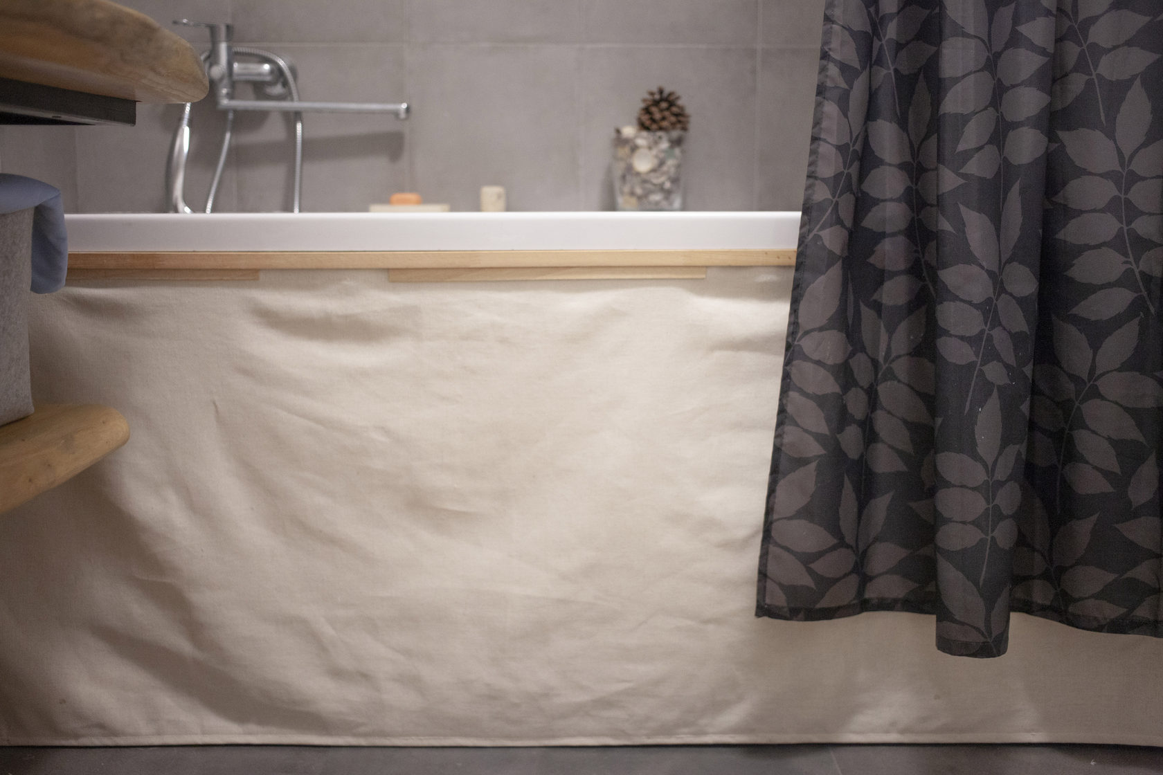 Вместо стандартного экрана для ванной мы разработали и сделали шторку из натуральной ткани и конструкцию для ее крепления.